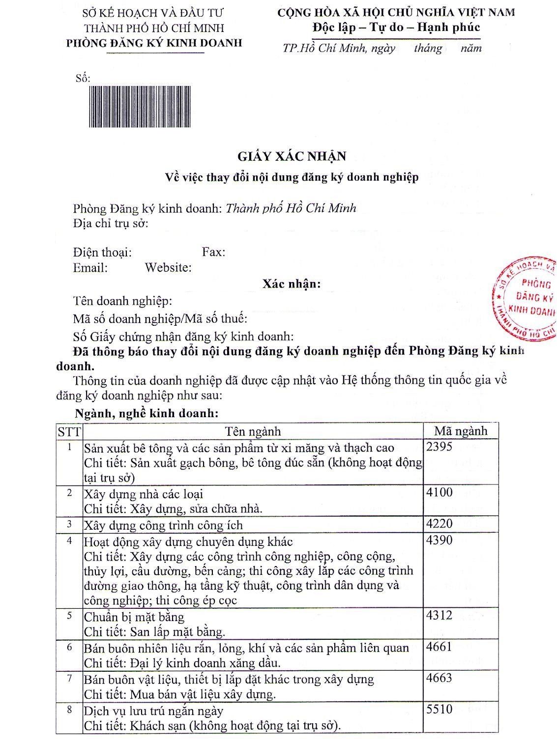 – Sau khi tiếp nhận hồ sơ thông báo thay đổi ngành, nghề kinh doanh của công ty, Cơ quan đăng ký kinh doanh cấp tỉnh trao giấy tiếp nhận hồ sơ và hẹn trả kết quả cho người nộp hồ sơ;